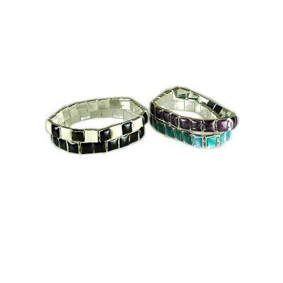 This bracelet (5/16” squares) is a s-t-r-e-t-c-h modern, youthful, clean looking bracelet which is offered as an assortment in many colors (Solid black, blue shades, purple marble, black & white, pink marble). A contemporary look…especially with casual outfits. $15.00 retail.