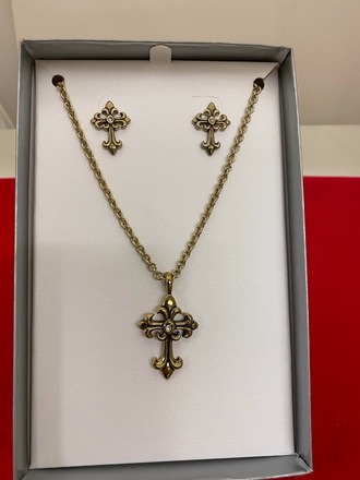Fabulous Antique Gold Cross Necklace with matching earrings in gift box. Has $18.00 retail on each item! Your cost $1.49 set!